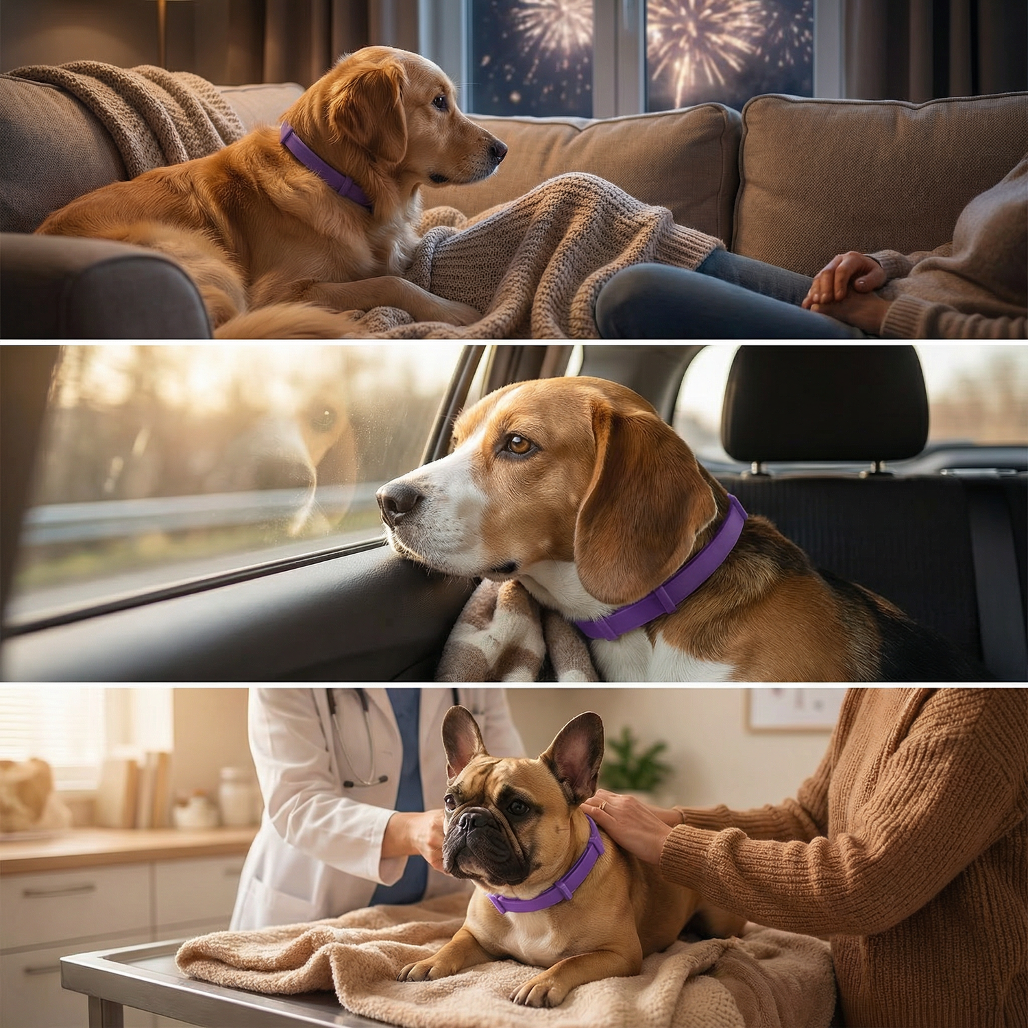 Many dogs appear calmer during stressful situations like storms, travel, and vet visits.